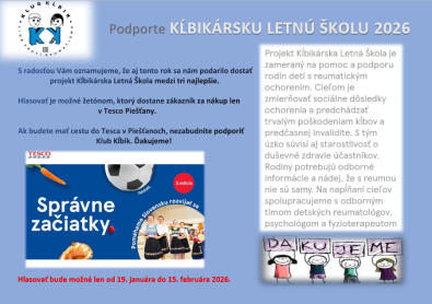 V dňoch 19.01.-15.02.2026 prebieha hlasovanie v Tescu v Piešťanoch aj za náš projekt Kĺbikárska Letná Škola 2026.